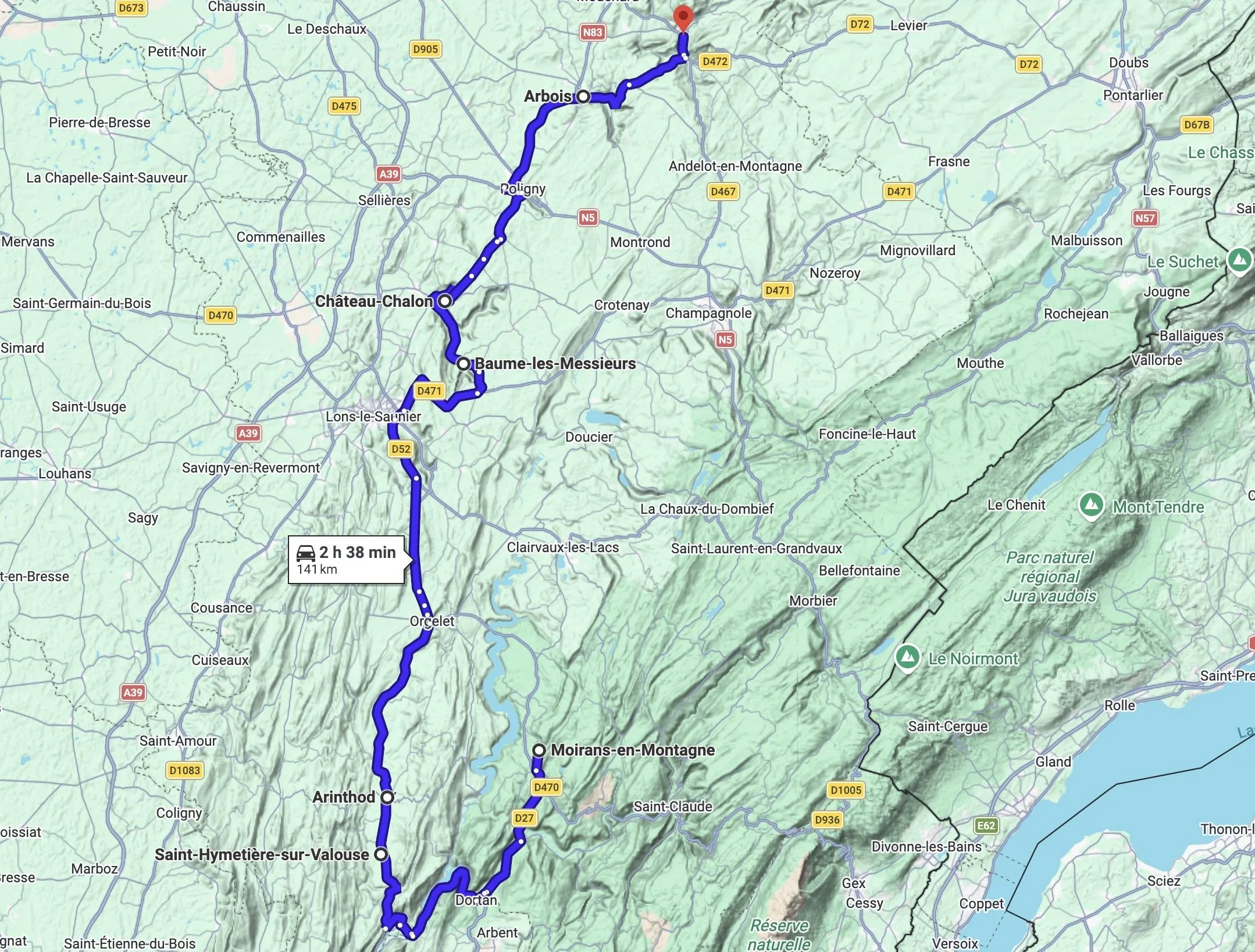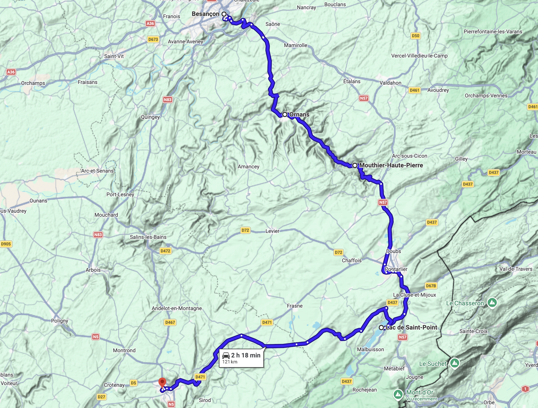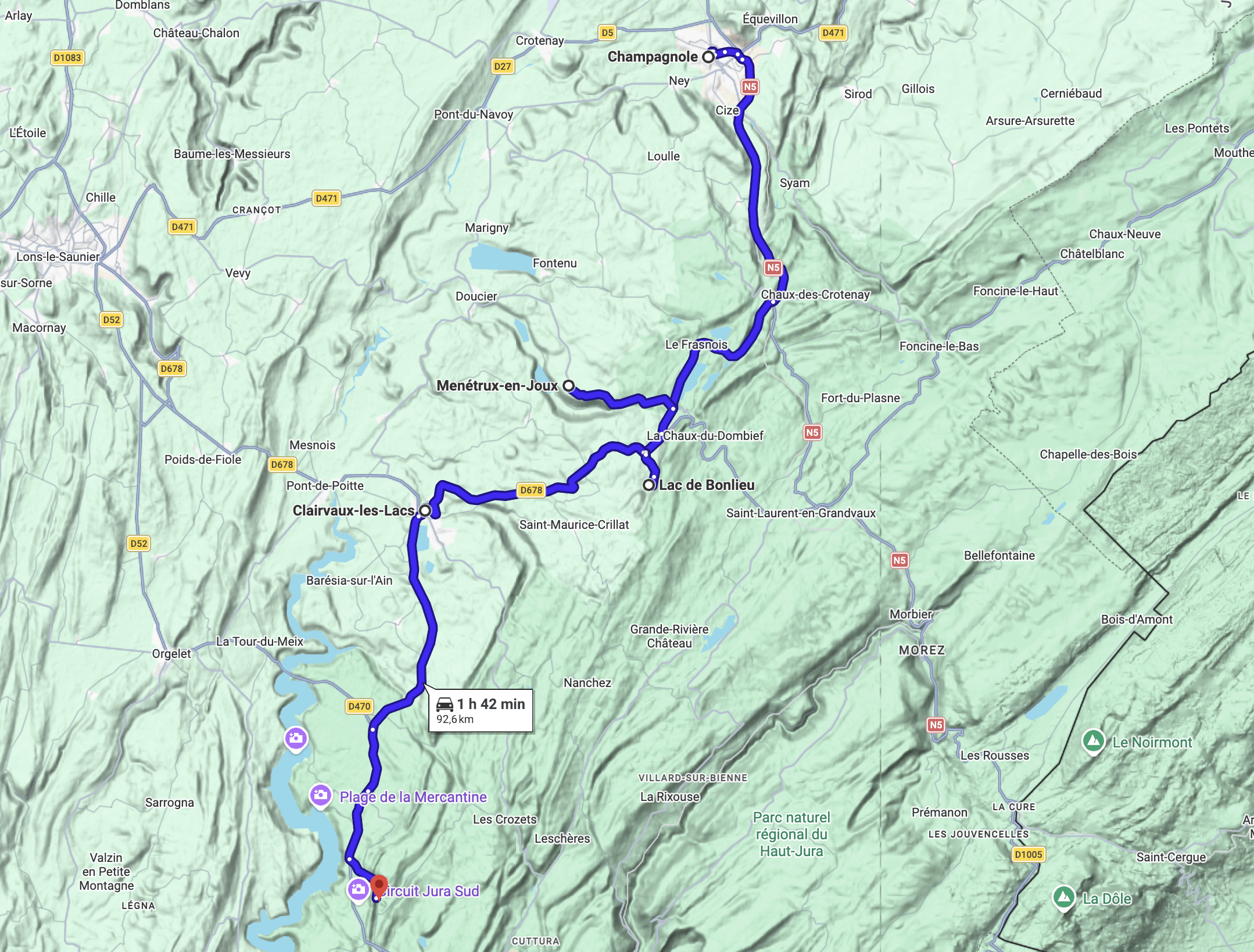 Départ : Besançon • Arrivée : Champagnole • Distance : environ 165 km • Durée estimée : 4h à 5h (hors pauses)