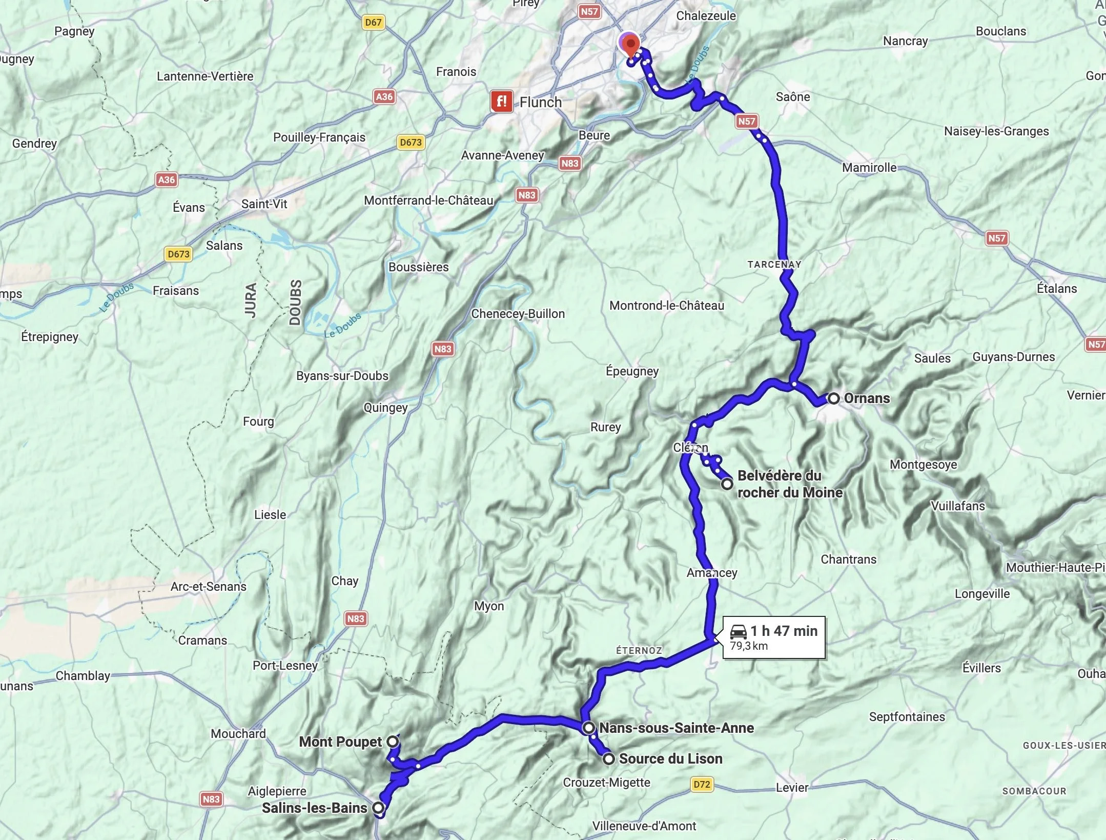 Je vous propose un circuit au départ de Besançon, une ville que je connais bien pour y vivre depuis plusieurs années. Si vous souhaitez prendre le temps de la visiter, prévoyez d’arriver sur place la veille de votre départ ou d’y rester quelques heures au retour. Vous trouverez de quoi vous en mettre plein les yeux tout en traversant les siècles !